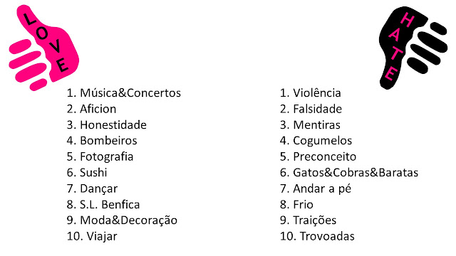 A TAG ♥ Love/Hate consiste em referir 10 coisas que a/o blogger ama e odeia. Para começar, coloquei o logótipo da tag (que podes encontrar imensaaas no google) e por fim, nomear 10 blogs para responderem à referida tag.